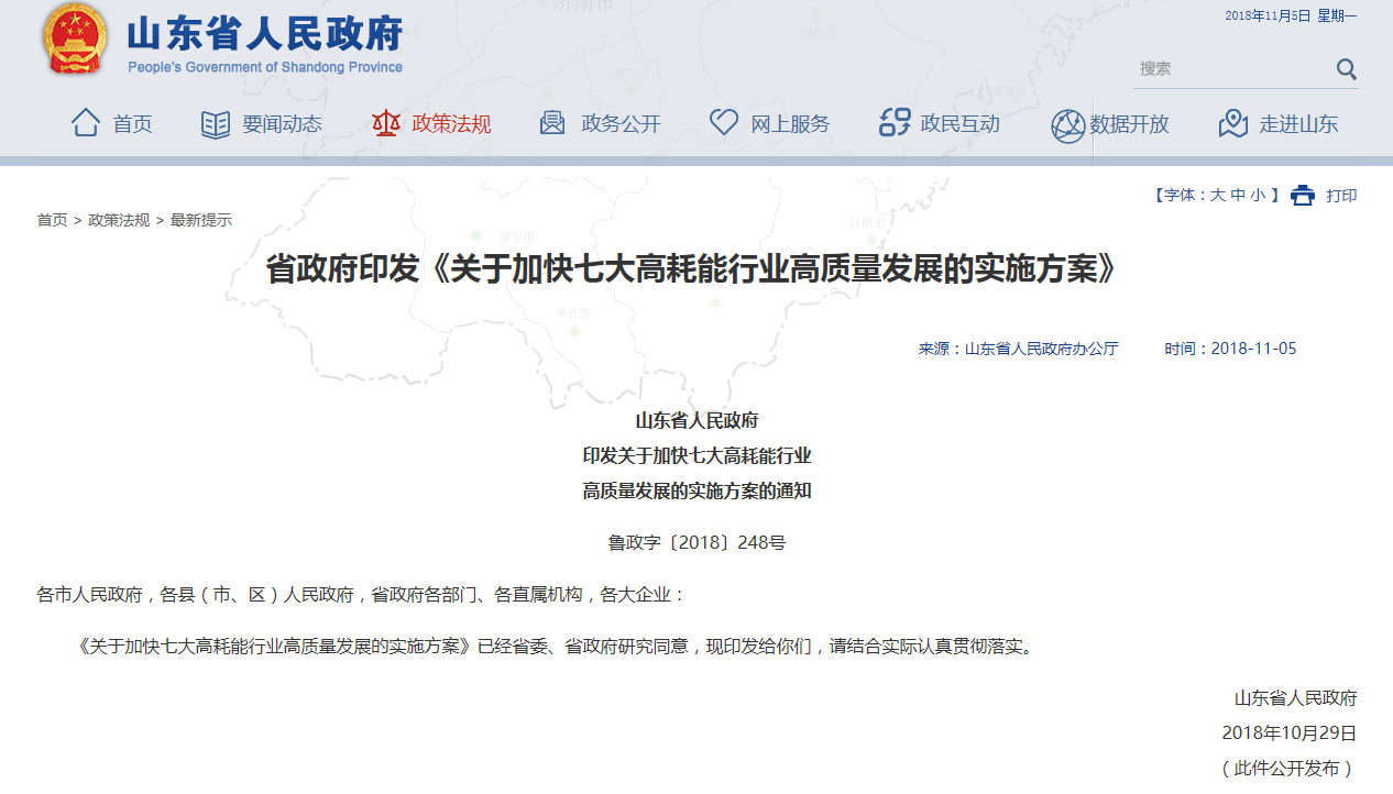 近日山東省人民政府印發(fā)《關于加快七大高耗能行業(yè)高質量發(fā)展的實施方案的通知》,